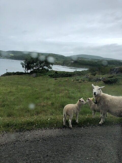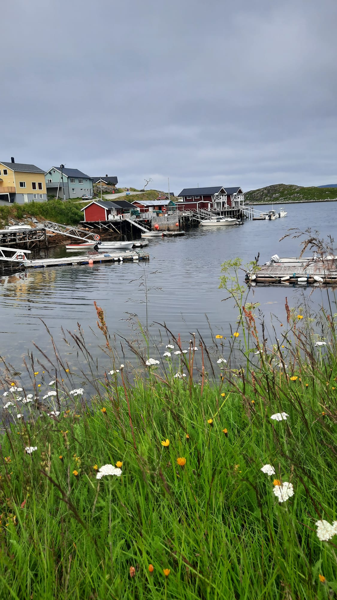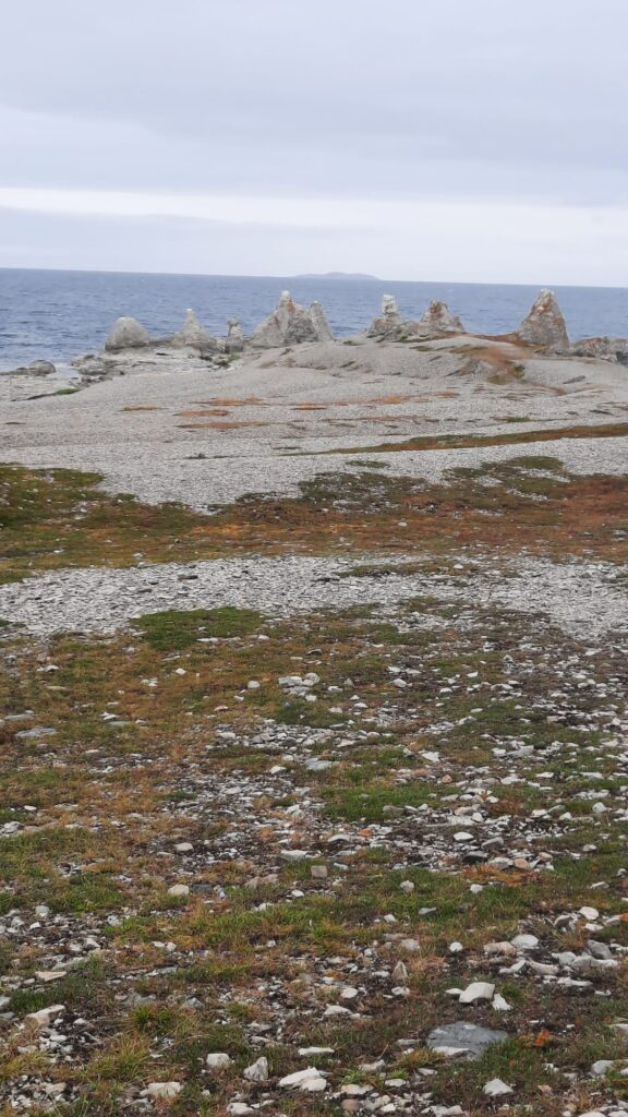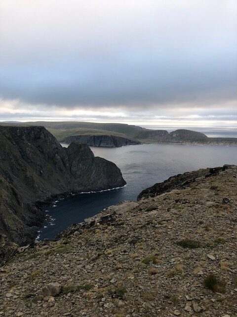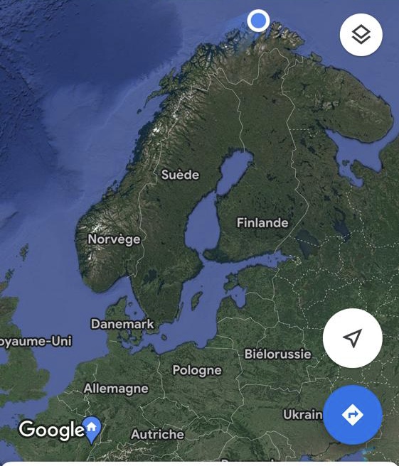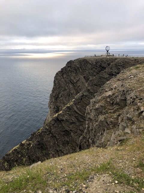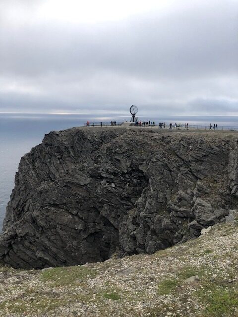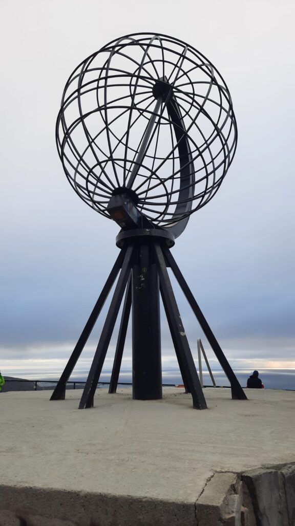 Le 19 juillet nous avons passé la frontière Norvégienne. Nous sommes allés déclarer le chien afin que tout soit en ordre. La pluie ne s’arrêtant pas, nous bivouaquons au bord d’un lac pour se reposer. A Kautokeino, nous avons visité une magnifique galerie. De l’artisanat local, des petits trésors Sami, une vue sur les moutons de la bergerie à travers une baie vitrée, le tout dans une magnifique demeure où règne une atmosphère paisible. C’est un tout autre décors et une autre atmosphère qui nous attendent à Trollholmsund. Du vent de la pluie, et une petite promenade le long d’un fjord, sur une côte rocailleuse au milieu des moutons nous conduit à d’étonnants rochers dont la forme rappelle celle des trolls. Nous bivouaquons au bord du fjord avant de reprendre la route. Cette route est splendide, elle serpente le long d’un fjord de la mer de Barents, les paysages sont variés les rênes sont partout et, malgré un ciel couvert, les couleurs du fjord sont magnifiques. Puis un tunnel sous la mer nous conduit à l’île de Mageroya. Après la visite d’un joli village de pêcheurs et la traversée d’un immense plateau désertique parsemé de lacs plus ou moins grands, nous atteignons le Cap Nord vendredi 21 juillet, une semaine exactement après notre départ et 3900km. Le ciel est nuageux avec quelques éclaircies par moment. Un fort vent donne un peu d’agitation à notre boîte fugueuse et il fait 7 degrés dehors On est bien content d’avoir du chauffage et on pense aux cyclotouristes qui ont planté la tente à quelques pas de nous. En soirée les lumières sur la mer de Barents donnent une atmosphère magique à ce lieu battu par les vents. A minuit le site est toujours aussi animé, une Tesla recharge sa batterie, les bus continuent d’amener les touristes admirer le soleil de minuit. Malheureusement pour cette nuit, le soleil n’était pas au rendez-vous mais la luminosité est surprenante à cette heure avancée de la « nuit » 🤪 Il faudra attendre un prochain article pour peut-être voir le soleil de minuit 😉