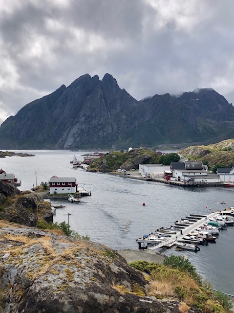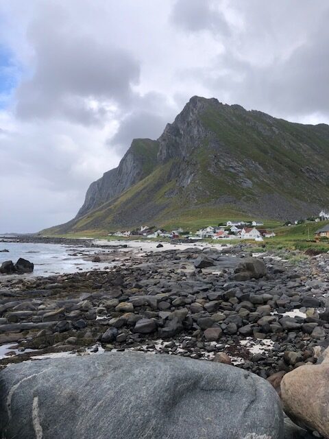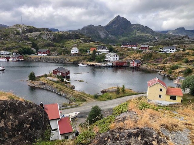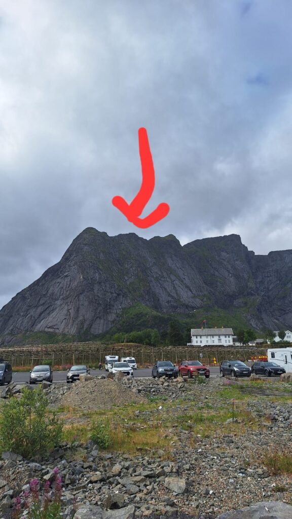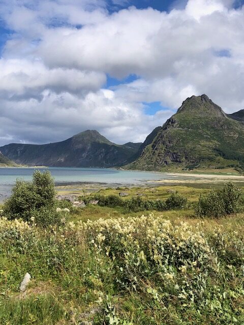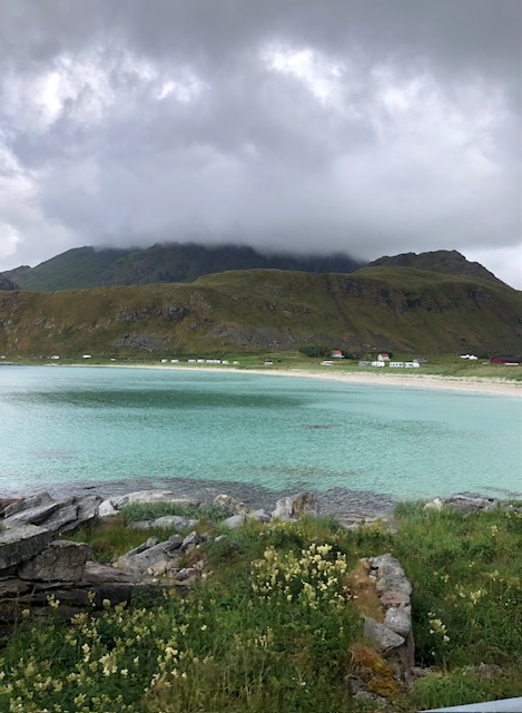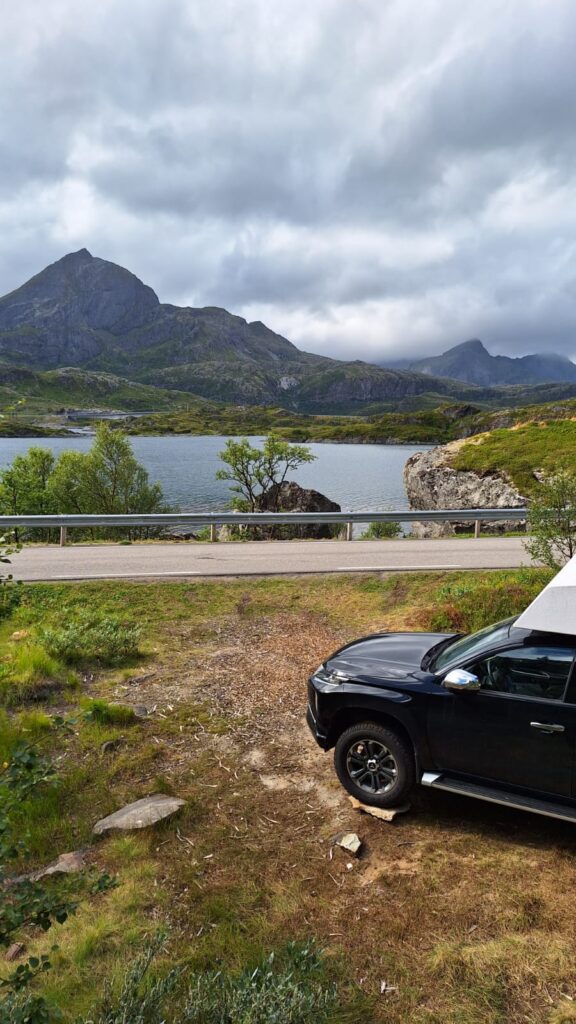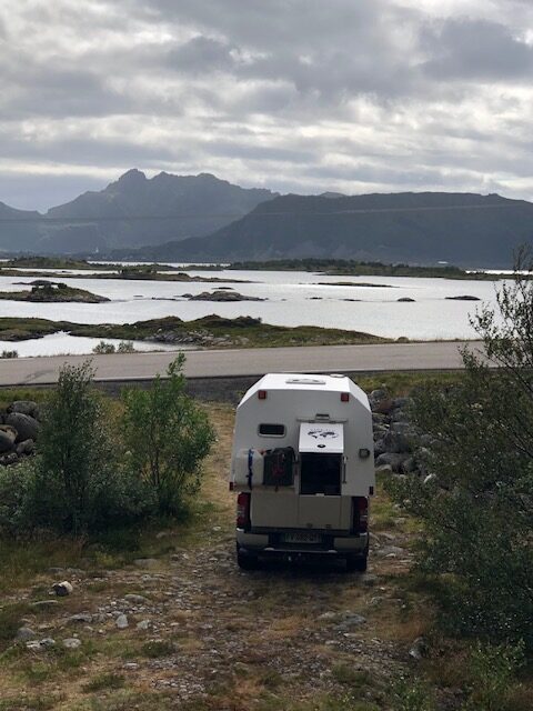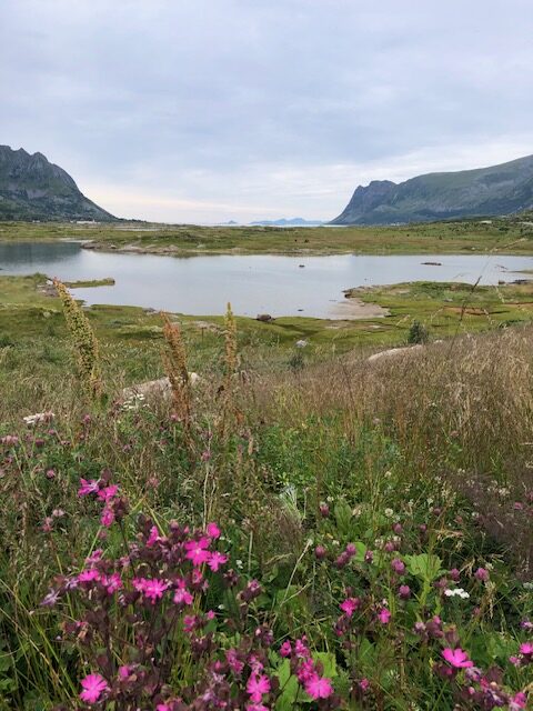 Ce n’est que plus tard que je pourrai dire ce que je retiens vraiment des Lofoten. J’en ai pas été surprise par le tourisme. Au contraire, j’ai trouvé que les visites sont plutôt fluides. Nous pensions avoir des difficultés à trouver des endroits pour dormir, mais en s’y prenant assez tôt en fin d’après-midi et avec un petit véhicule, nous avons toujours trouvé des endroits sympas, avec une jolie vue pour bivouaquer (gratuitement). Les villages ne sont plus des villages de pêcheurs mais des résidences hôtelières. Tout est organisé pour le tourisme. L’unique route qui traverse l’archipel est très bien aménagée avec des points de vue avec parking et toilettes. On est guidé pour traverser les Lofoten, il n’y a pas d’accès à la nature autre que celui proposé pour les touristes. Il y a bien des randonnées à faire, elles sont souvent longues et difficiles. Nous n’avons pas l’entraînement et les conditions météo ne nous ont pas donné envie de nous lancer. La météo n’a pas vraiment été avec nous mais cela aurait pu être pire. Oui, nous avons eu quelques gouttes de pluie, des nuages, du vent les derniers jours, mais les nuages sont restés en altitude et nous avons toujours pu avoir une vue sur la nature. Ce que je retiens aujourd’hui, ce sont des paysages magnifiques, des couleurs partout. Pendant toute la traversée des Lofoten, il y a quelque chose à regarder. Devant, à gauche à droite, la mer, un lac un rorbu, une montagne, une plage, des rochers le tout un peu mélangé… indescriptible… mais magnifique même sous les nuages. Si dessous, la photo que nous n’avons pas faite 😂