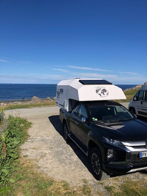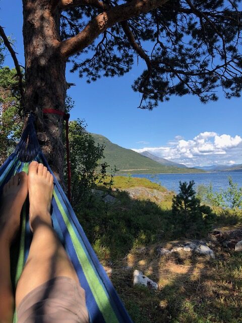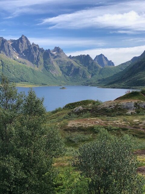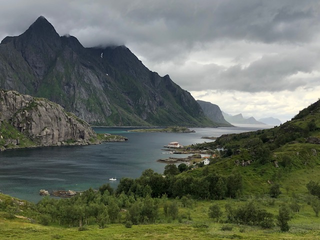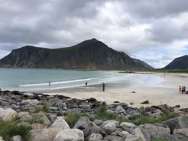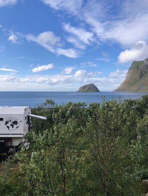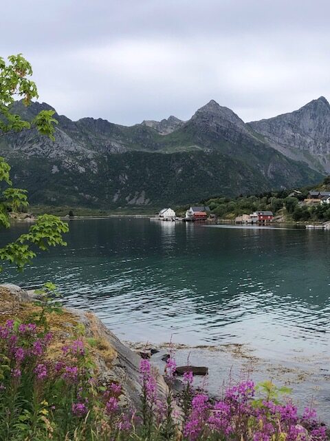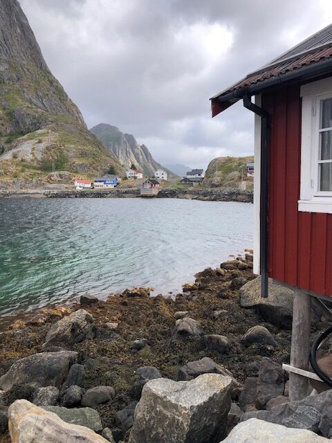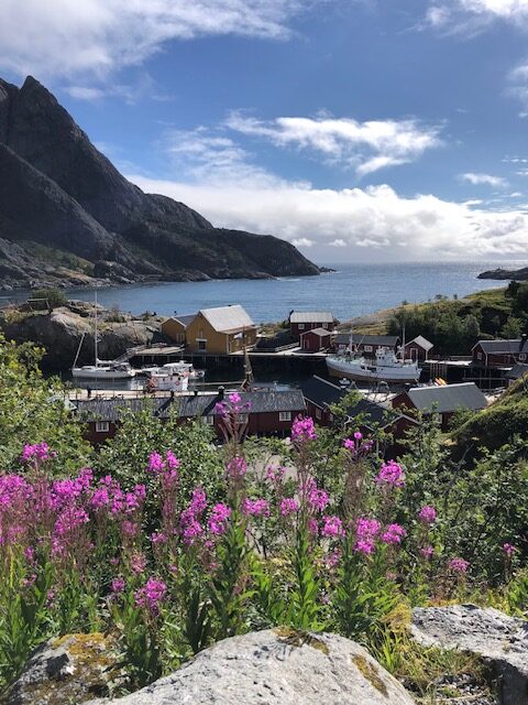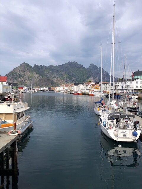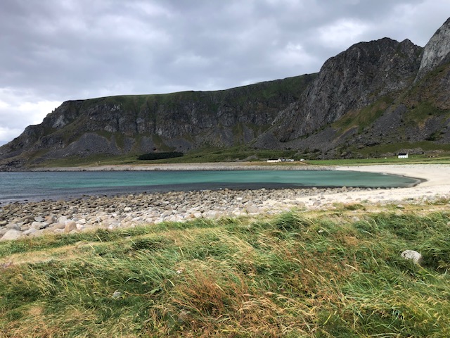 Ce n’est que plus tard que je pourrai dire ce que je retiens vraiment des Lofoten. J’en ai pas été surprise par le tourisme. Au contraire, j’ai trouvé que les visites sont plutôt fluides. Nous pensions avoir des difficultés à trouver des endroits pour dormir, mais en s’y prenant assez tôt en fin d’après-midi et avec un petit véhicule, nous avons toujours trouvé des endroits sympas, avec une jolie vue pour bivouaquer (gratuitement). Les villages ne sont plus des villages de pêcheurs mais des résidences hôtelières. Tout est organisé pour le tourisme. L’unique route qui traverse l’archipel est très bien aménagée avec des points de vue avec parking et toilettes. On est guidé pour traverser les Lofoten, il n’y a pas d’accès à la nature autre que celui proposé pour les touristes. Il y a bien des randonnées à faire, elles sont souvent longues et difficiles. Nous n’avons pas l’entraînement et les conditions météo ne nous ont pas donné envie de nous lancer. La météo n’a pas vraiment été avec nous mais cela aurait pu être pire. Oui, nous avons eu quelques gouttes de pluie, des nuages, du vent les derniers jours, mais les nuages sont restés en altitude et nous avons toujours pu avoir une vue sur la nature. Ce que je retiens aujourd’hui, ce sont des paysages magnifiques, des couleurs partout. Pendant toute la traversée des Lofoten, il y a quelque chose à regarder. Devant, à gauche à droite, la mer, un lac un rorbu, une montagne, une plage, des rochers le tout un peu mélangé… indescriptible… mais magnifique même sous les nuages. Si dessous, la photo que nous n’avons pas faite 😂