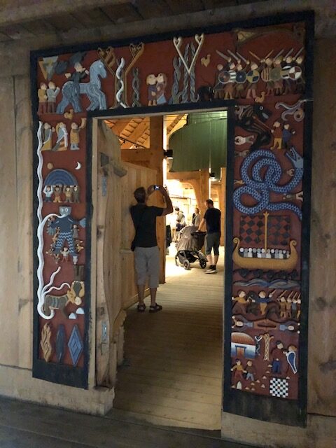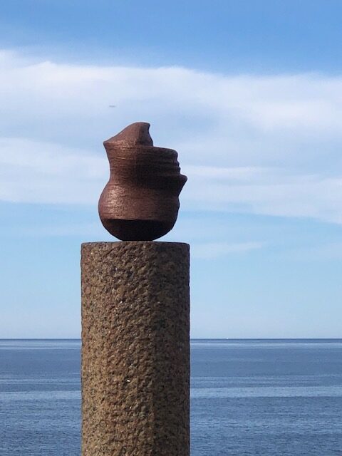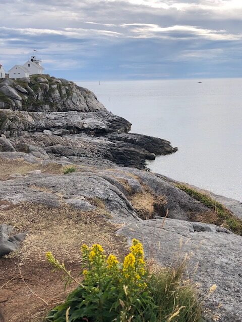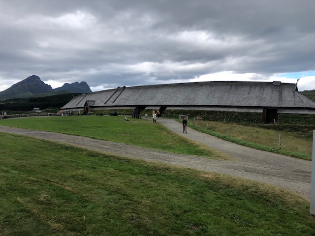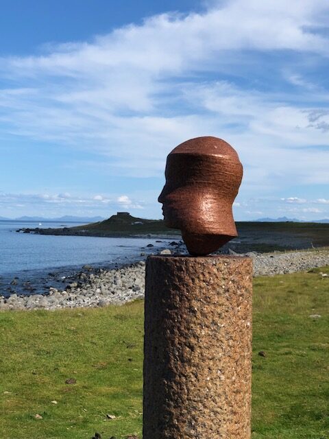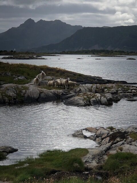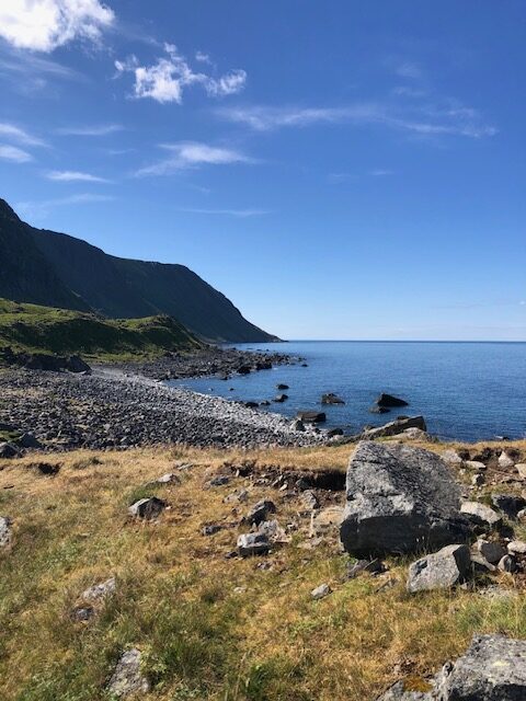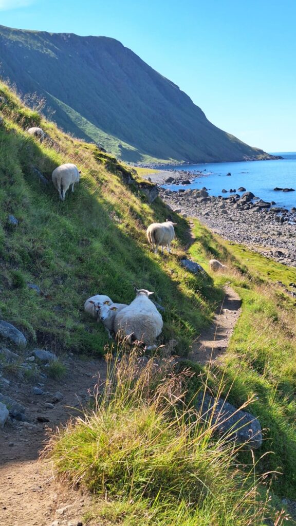 Nous poursuivons la route avec la découverte d’un temple protestant tout en bois puis nous visitons Henningsvaer que les guides touristiques appellent la Venise des Lofoten. La route d’accès ressemble à une route de la Côte d’Azur au mois d’août ou presque… déjà là nous étions un peu refroidi… Nous avons réussi à trouver une place de parking pour la visite mais cette ville ne nous a pas enchanté. Nous n’avons pas trouvé de point de vue pour avoir une belle vision d’ensemble et surtout, nous avons choisi un jour de festival pour visiter. Il y avait des tentes partout dans la montagne. Nous avons donc continué notre route pour laisser la place aux festivaliers 😉 Sans vraiment être déçus, nous décidons de nous poser une journée en bord de mer pour découvrir la nature. Il fait beau, il fait chaud et nous partons pour une randonnée le long de la côte jusqu’à une plage de sable blanc. Nous avons dû rebrousser chemin avant d’atteindre notre but car le sentier passe par un éboulis avec de grosses pierres plates à escalader. Nous commençons à grimper en guidant Mala qui glisse sur les pierres. Cet éboulis est en à pic au dessus de la mer, nous entendons les vagues s’écraser avec fracas en dessous de nous… c’est là que nous avons décidé de faire demi tour. La randonnée est classée modérée… Lors des balades que nous avons déjà faites en Norvège, nous sommes régulièrement surpris par le fait que les points de vues ou les passages dangereux ne sont pas sécurisés comme ce qu’on a l’habitude de le voir en France. Est ce qu’ici chacun prend ses responsabilités… Néanmoins, nous avons été enchanté par cette randonnée. Le chemin est fréquenté, mais les lieux restent tranquilles. Nous avons marché au milieu des agneaux qui appellent leurs mamans, un peu plus loin c’est le cri d’une loutre de mer qui a attiré notre attention (elle était un peu trop loin pour avoir une jolie photo). Cette rando était déroutante à tous les niveaux, marcher dans les alpages mais au bord de la mer, sentir l’odeur des moutons et celle des algues en même temps, regarder la montagne et entendre la mer… même l’étonnante sculpture le long du sentier nous a mis la tête à l’envers 🙃 En fin de journée, le ciel s’est couvert sur la terre. A l’horizon, sur la mer, le ciel était dégagé et nous a permis de voir le soleil se coucher pour une petite nuit de trois heure et demie. Tout ici semble déroutant, quelque chose qui paraît être un obstacle est compensé par quelque chose de magnifique, tous les sens sont en permanence sollicités, on arrive facilement à tout relativiser, la beauté du paysage nous aide à voir les choses de façon positive…