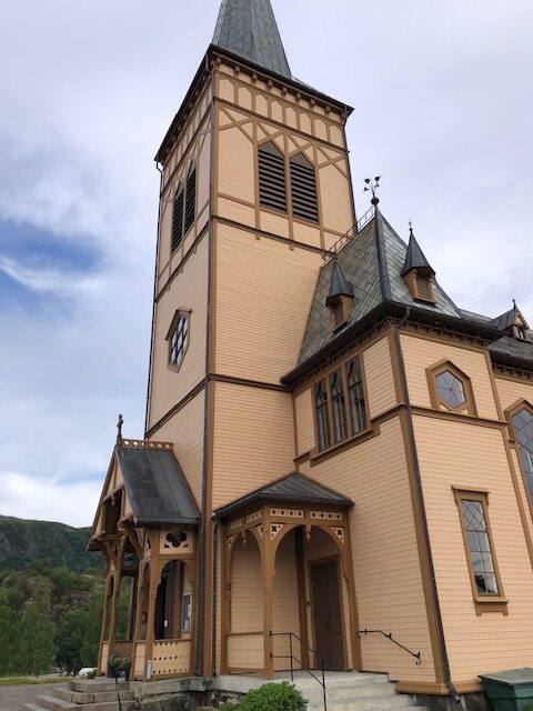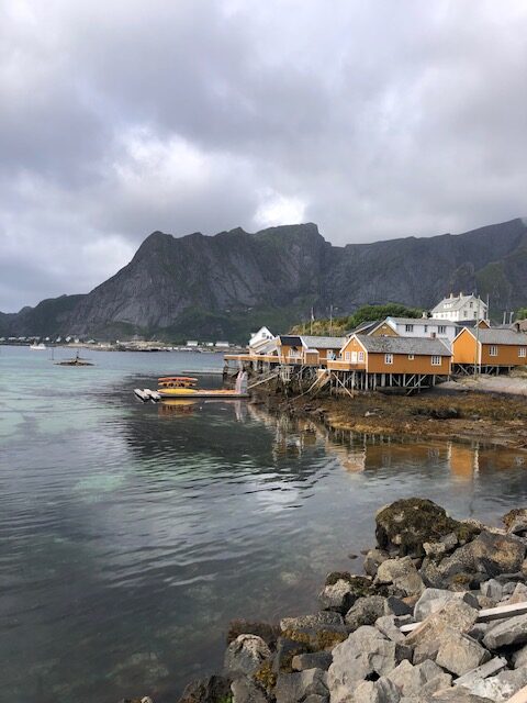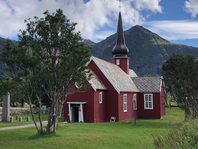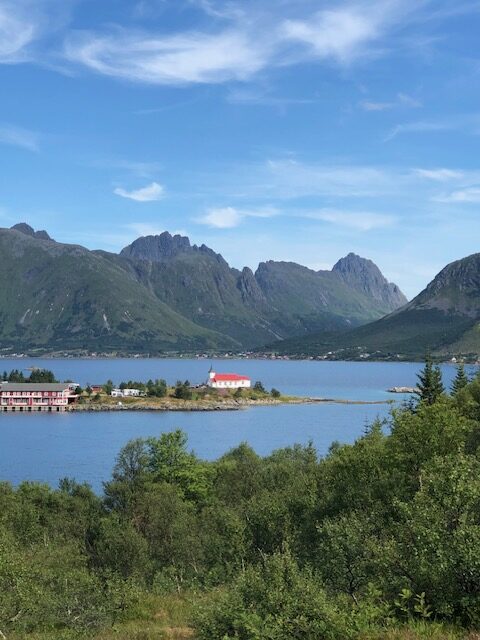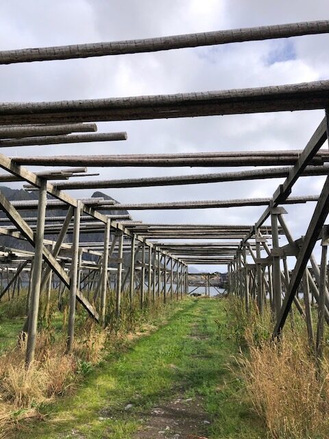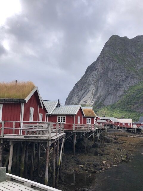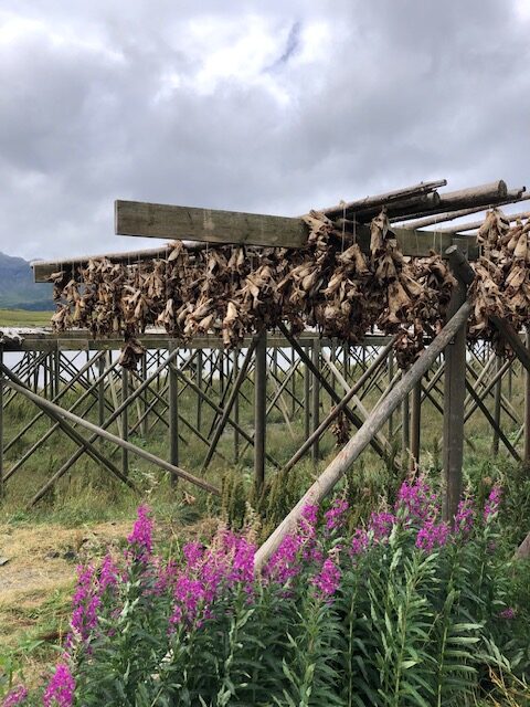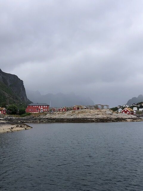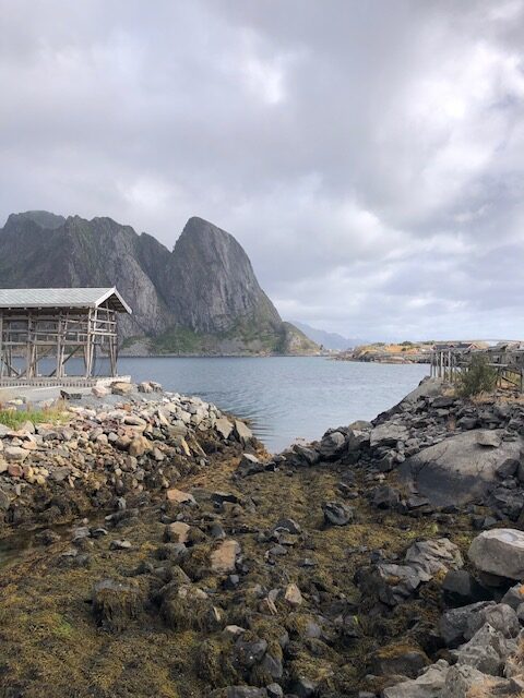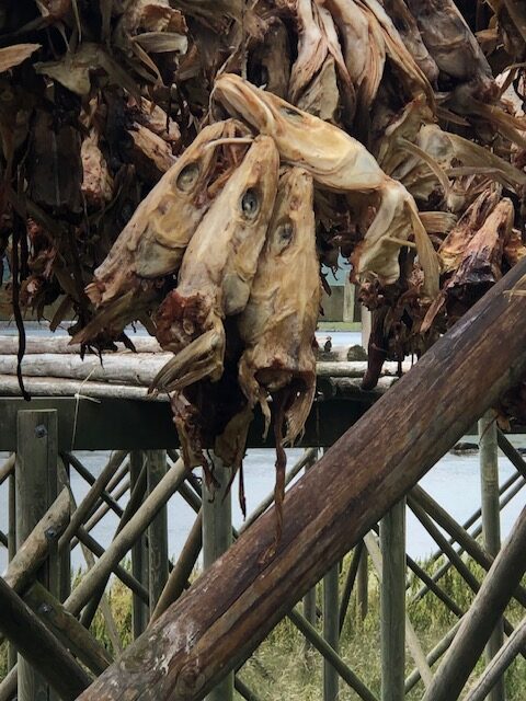 Nous reprenons la route avec un ciel très bas et peu de visibilité. Encore quelques plages de sable blanc entourées de rochers, des montagnes dont on ne voit pas les sommets puis le ciel se dégage et nous permet de profiter des jolies couleurs de Nusfjord. C’est un village de rorbu. Un rorbu est une cabane de pêche sur pilotis. Maintenant les rorbuer (pluriel de rorbu 😉)sont utilisés pour loger les touristes. Nous avons visité un village qui ressemblait à un village vacances, Nusfjord fait plutôt penser à un musée où les bateaux de pêches sont remisés dans des hangars et laissent la place aux hors-bord, kayak et bateaux aménagés pour les touristes. Nous ne trouvons pas forcément les villages jolis, ce sont des maisons éparpillées sur la côte, sans cœur de village. Nous sommes peut-être trop habitués aux jolis villages que l’on trouve près de chez nous. Par contre, ces villages sont nichés dans des endroits magnifiques, entre mer et montagne, parsemés d’îlots. C’est ce cadre qui les rend magnifiques. Les Lofoten sont réputés pour la morue. Partout nous voyons des séchoirs à poisson. Ils sont pour la plupart vides, la saison de la morue est terminée. La pêche au cabillaud se fait de février à avril. Les poissons sont ensuite vidés et séchés 3 mois en extérieur puis 3 mois en intérieur. Nous n’en n’avons donc pas vu sur les séchoirs mais en se rapprochant de Sund, nous trouvons un séchoir à poisson garni. On s’approche pour faire des photos… ça pue… désolée, mais il n’y a pas d’autres mots 😂 Il n’y avait que les têtes et nous ne savons pas pourquoi. Sund, n’est pas très fréquenté, il y a très peu de touristes ici, c’est un véritable village de pêcheur. Avant d’arriver à Sund, nous avons vu une jolie église en bois rouge et encore une plage de sable blanc où malgré la température n’excédant pas les 17 degrés, certains jouent dans l’eau. Les plages sont très jolies, l’eau translucide mais… non, ça ne nous donne pas envie de nous baigner 😂