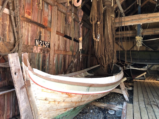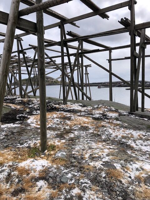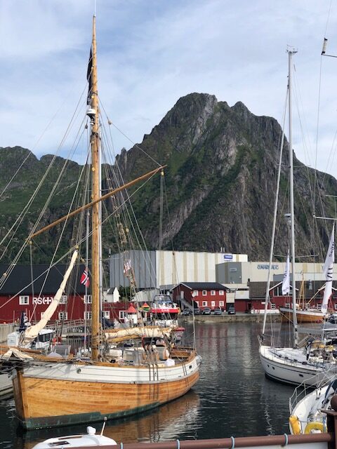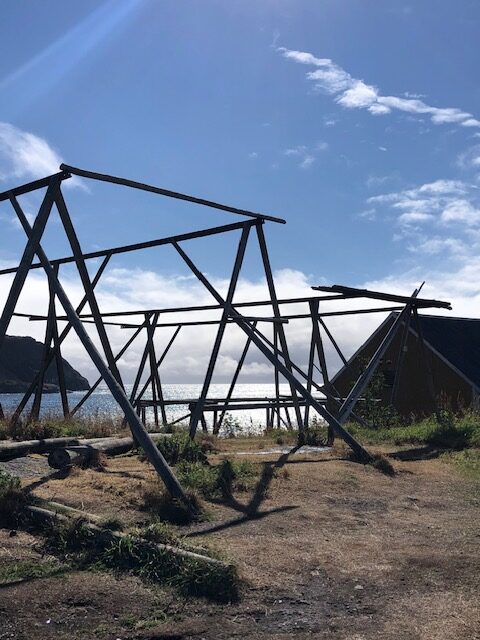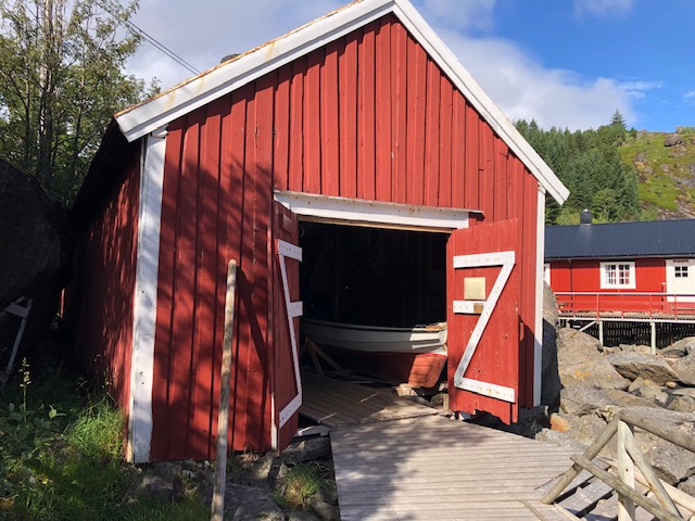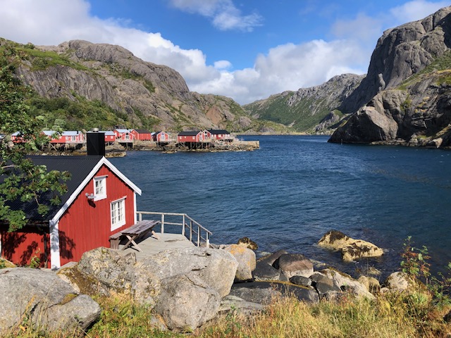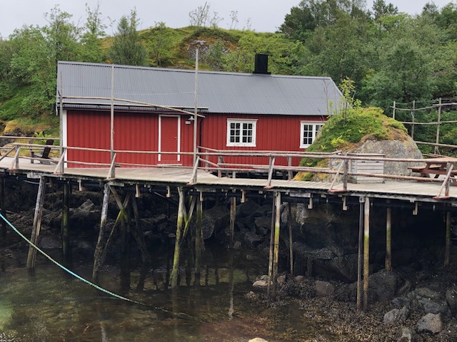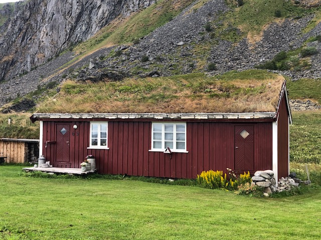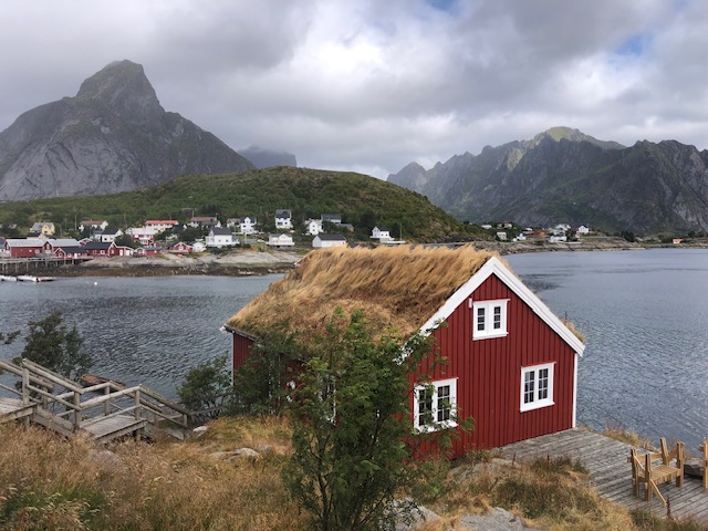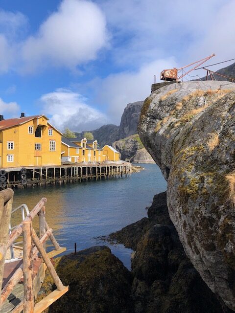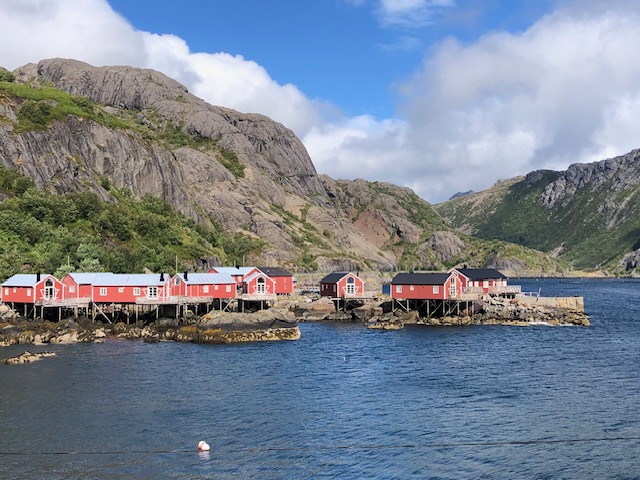 Nous reprenons la route avec un ciel très bas et peu de visibilité. Encore quelques plages de sable blanc entourées de rochers, des montagnes dont on ne voit pas les sommets puis le ciel se dégage et nous permet de profiter des jolies couleurs de Nusfjord. C’est un village de rorbu. Un rorbu est une cabane de pêche sur pilotis. Maintenant les rorbuer (pluriel de rorbu 😉)sont utilisés pour loger les touristes. Nous avons visité un village qui ressemblait à un village vacances, Nusfjord fait plutôt penser à un musée où les bateaux de pêches sont remisés dans des hangars et laissent la place aux hors-bord, kayak et bateaux aménagés pour les touristes. Nous ne trouvons pas forcément les villages jolis, ce sont des maisons éparpillées sur la côte, sans cœur de village. Nous sommes peut-être trop habitués aux jolis villages que l’on trouve près de chez nous. Par contre, ces villages sont nichés dans des endroits magnifiques, entre mer et montagne, parsemés d’îlots. C’est ce cadre qui les rend magnifiques. Les Lofoten sont réputés pour la morue. Partout nous voyons des séchoirs à poisson. Ils sont pour la plupart vides, la saison de la morue est terminée. La pêche au cabillaud se fait de février à avril. Les poissons sont ensuite vidés et séchés 3 mois en extérieur puis 3 mois en intérieur. Nous n’en n’avons donc pas vu sur les séchoirs mais en se rapprochant de Sund, nous trouvons un séchoir à poisson garni. On s’approche pour faire des photos… ça pue… désolée, mais il n’y a pas d’autres mots 😂 Il n’y avait que les têtes et nous ne savons pas pourquoi. Sund, n’est pas très fréquenté, il y a très peu de touristes ici, c’est un véritable village de pêcheur. Avant d’arriver à Sund, nous avons vu une jolie église en bois rouge et encore une plage de sable blanc où malgré la température n’excédant pas les 17 degrés, certains jouent dans l’eau. Les plages sont très jolies, l’eau translucide mais… non, ça ne nous donne pas envie de nous baigner 😂