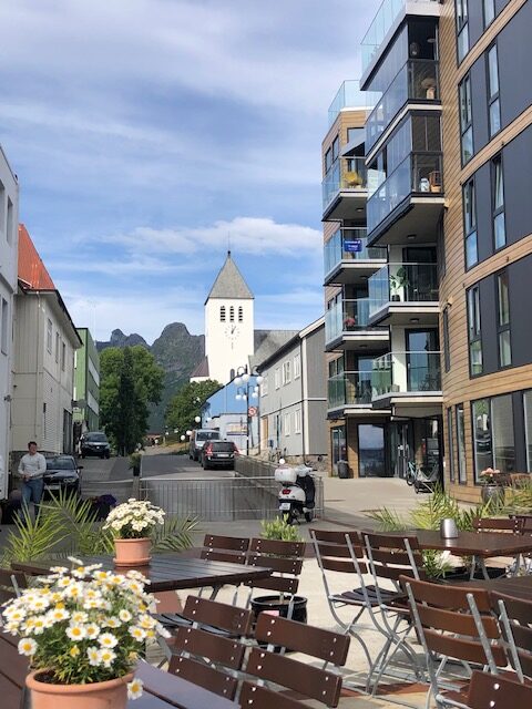 Nous arrivons aux îles Lofoten le 31 juillet. Mais avant ça, nous avons dû faire un détour par Narvik. En faisant une vidéo sur un belvédère de l’île de Senja, le téléphone de Laurent s’est bloqué sur la page d’accueil. Impossible de l’allumer, impossible de l’éteindre. Nous avons essayé le redémarrage forcé mais sans résultat. Le téléphone de Laurent sert entre autre de téléphone, mais aussi de GPS (avec toutes les cartes de Norvège téléchargées et le parcours tracé avec les points d’interêt). Il sert aussi de télécommande pour le drone et de moyen de paiement avec les applications téléchargées pour les ferry ou pour les parkings… À Narvik, nous avons acheté un téléphone et trouvé suffisamment de réseau pour recharger tout ce dont nous avions besoin ou presque… Le prix du téléphone en Norvège est le même que si nous avions acheté ce même téléphone chez Boulanger en France et notre forfait internet nous a permis de tout recharger sans surcoût 😉 Mais si l’ancien téléphone ne redémarre pas, les photos et vidéos prises par Laurent depuis notre départ seront perdues… C’est donc avec un téléphone tout neuf et un grand soleil que nous arrivons dans les Lofoten. Nous avons trouvé un petit bivouac accessible uniquement aux 4×4 sur lequel nous pouvons installer le hamac et profiter de la jolie vue sur la mer. Bientôt, nous allons enfin découvrir les îles Lofoten qui nous font rêver. C’était avec le Cap Nord un but à atteindre. Si pour le Cap Nord, je n’avais pas d’attentes particulières, j’espère découvrir ici les fabuleux paysages qui m’ont fait rêver en regardant des photos ou des vidéos de voyageurs qui sont venus dans les Lofoten. Nous sommes toujours au Nord de la Norvège, au dessus du cercle polaire arctique. Les îles Lofoten sont reliées par des ponts ou des tunnels. Après avoir pris au moins 10 km de tunnels, sous la mer et sous la montagne, nous voici sur la route panoramique des Lofoten. Nous ne sommes pas déçu par le premier point de vue. Puis la route nous conduit à Svolvaer. C’est une des villes principales de l’archipel des Lofoten. Bien qu’elle soit très touristique, cette ville reste calme. C’est le départ d’excursions en mer en canoë, en voilier ou en bateau à moteur, essentiellement pour admirer les oiseaux marin dont les aigles de mer. Nous avons profité de cette étape pour déguster un délicieux fish and ships dans un restaurant en bord de mer. Notre visite des îles Lofoten commence plutôt bien.