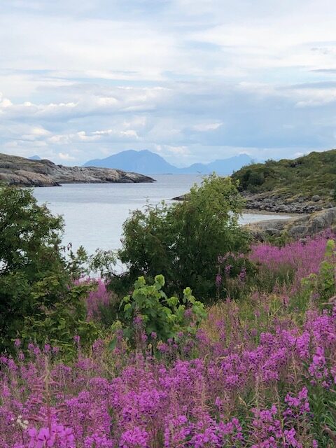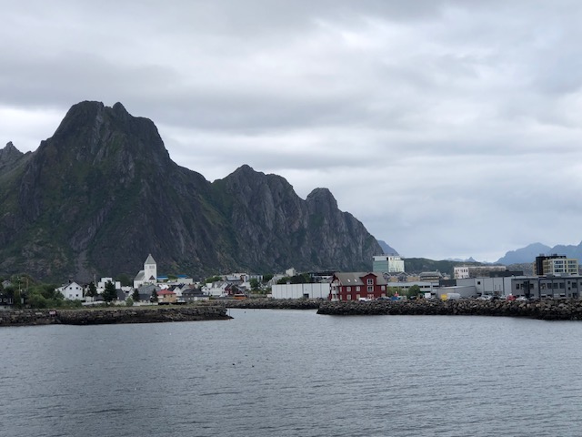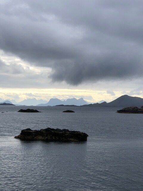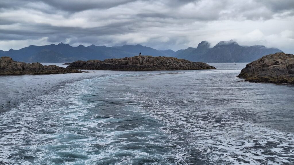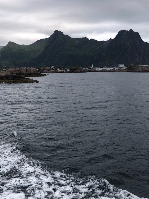 Nous arrivons au bout de notre parcours dans les Lofoten. Encore Reine à voir et le dernier village Å. Le temps ne se lève pas, le ciel reste couvert avec de grandes bourrasques de vent. Nous avons prévu de monter au dessus de Reine pour admirer la vue souvent mise en avant pour représenter les Lofoten. 522m de dénivelé… Nous nous préparons, mais les nuages de plus en plus épais nous découragent… Que dire de Å… Nous avons traversé le village en voiture, nous ne l’avons pas trouvé joli et toujours du vent du crachin, encore un parking à payer certainement hors de prix comme celui de Reine. Du monde, et toujours très peu de vue… Même pas une photo, nous rebroussons chemin et nous terminons la visite des Lofoten sur cette note plutôt négative. Il y a certainement de jolies randonnées à faire dans cette partie des Lofoten. Mais ce n’est pas ici que je me suis sentie le mieux. La météo en est en partie la cause, mais pas uniquement. Tout l’archipel est touristique, il y a beaucoup de camping-cars mais aussi des gens qui dorment dans leur voiture, des cyclistes des motards, quelques randonneurs… On se croise sur les parkings, sur les routes mais les visites restent en général calmes. A Reine ou à Å, les montagnes sont tellement hautes et proches de la mer que j’ai eu le sentiment d’être coincée entre la montagne et la mer et qu’il n’y avait pas assez de place pour tous ces touristes… Les nuages devaient accentuer cet impression d’enfermement…. Bref j’imaginais l’apothéose et je n’ai pas aimé 🤪 Nous reprenons les tunnels pour sortir de cette pointe des Lofoten, et nous retrouvons cette jolie plage de sable blanc, cette fois ce sont des surfeurs qui s’amusent. Puis, alors que nous avions l’impression que la route s’enfonçait dans une forêt de sapin, nous apercevons un coin de ciel bleu, une montagne au loin, la mer en contrebas… Un spectacle ouvert magnifique qui me remonte le moral. Encore une fois, nous faisons une petite étape et nous nous arrêtons au bord de ce joli fjord et nous nous promenons dans les rochers côté mer où nous ramassons des coquillages puis côté terre où nous faisons une nouvelle récolte de myrtilles. Au dessus de nous un rapace, certainement un aigle avec un poisson dans les griffes. Je refais le plein de sensations positives et le 6 août, nous prenons le ferry et nous quittons les îles Lofoten. La sortie de l’archipel est impressionnante, le ferry slalome entre les rochers, les montagnes s’éloignent et disparaissent dans les nuages qui ne se lèvent toujours pas.