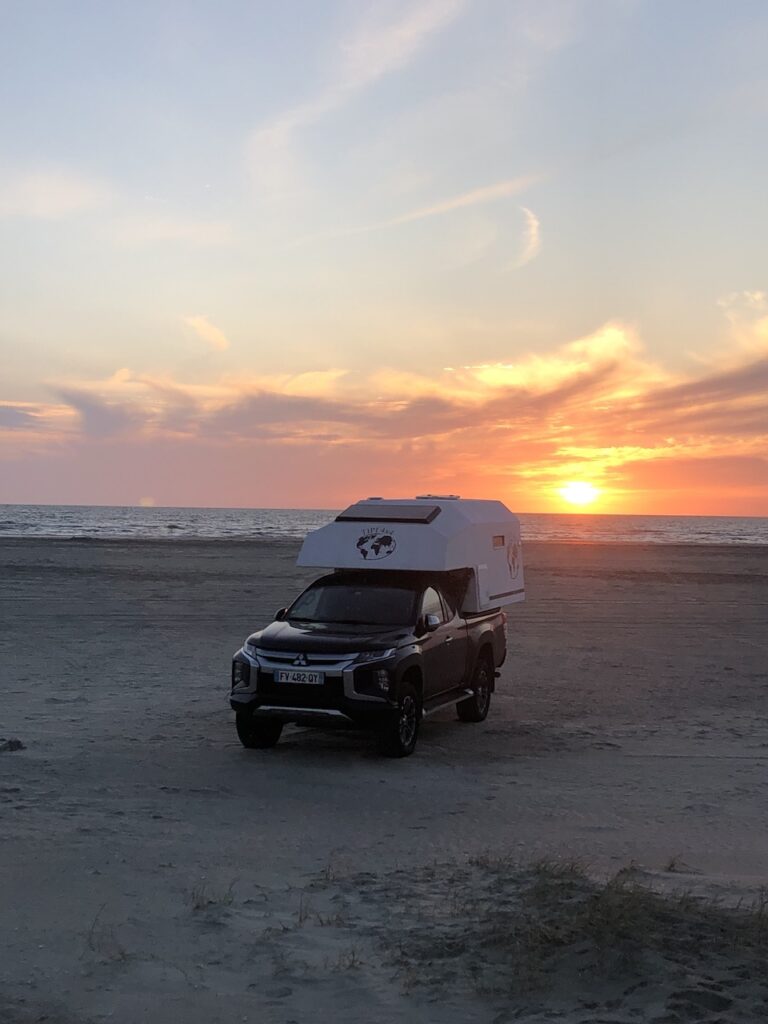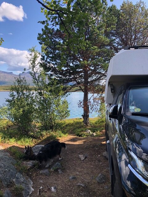 Nous avons fait effectivement beaucoup de route. 10450 km. Nous n’avons pas compté le nombre ou les kilomètres de tunnels que nous avons pris en Norvège. Au niveau des villes, il peut y avoir des ronds points dans les tunnels. Il faut savoir où l’on va car le GPS est un peu perdu sous terre même s’il y a de la 4G dans la plupart des tunnels comme à peu près partout en Norvège 🤪 Il y a 11 ans, lors de notre voyage en Norvège, nous avons été surpris par la patience et le calme des Norvégiens au volant. J’ai le souvenir de personnes qui s’installaient au bord de la route avec un livre aux feux de travaux. Aujourd’hui, les gens sont pressés, impatients, ils ne respectent ni les vitesses ni les feux de travaux, ils peuvent doubler à droite et surtout, leurs voitures n’ont pas de clignotants 🤪 Enfin, la circulation en Norvège est maintenant comme partout ailleurs. Nous avons roulé tous les jours. Parfois nous avons fait des petits sauts de puce. Les vacances pour nous, ce n’est pas une destination particulière, mais le chemin. Le pickup est très confortable, nous faisons des pauses régulières pour se dégourdir, pour visiter. Chaque matin nous quittons notre bivouac et nous ne savons pas où nous allons dormir. Tout est organisé dans la boîte de façon à ce qu’on puisse partir sans avoir trop de choses à ranger. Nous aimons les voyages itinérants et nous avons maintenant un peu d’expérience dans ce mode de vacances. Après la tente 2 places, la tente familiale, la caravane et le camping-car, nous faisons notre troisième voyage avec cette boîte fugueuse. Nous avons fait une petite vidéo de présentation de notre organisation. Par beau temps, nous nous installons dehors, mais c’est bien adapté pour tout faire à l’intérieur. Sauf peut-être la douche… Si vraiment on le voulais, nous pourrions nous organiser avec un petit bac pour prendre une douche à l’intérieur mais nous préférons la toilette au gant de toilette, lingettes à l’intérieur et la douche à l’extérieur quand c’est possible. Dans la vidéo, je précise que nous n’avons pas de chauffe eau, c’est un choix que nous avons fait car nous utilisions très peu le chauffe eau dans le camping car. Quand nous avons besoin d’eau chaude, nous la faisons chauffer dans une casserole 😉 Pour l’eau sale, nous avons installé un tube pvc plutôt que le sceau que nous devions vider sur place. Pour la toilette et pour la vaisselle, nous n’utilisons que des produits d’origine naturelle et biodégradables… Que dire de plus… petit et fonctionnel 👍 La vie à 3 demande un peu d’organisation, on ne peut pas se déplacer les 3 en même temps, c’est chacun son tour 🤪 Mala a très bien compris, elle sait se faire petite quand nous avons besoin de bouger. C’est vraiment un chien au top 👌 En voiture, elle a sa place à l’arrière, parfois elle regarde la route sur le côté ou devant et parfois elle vient chercher des papouilles sur les genoux du passager 😉
