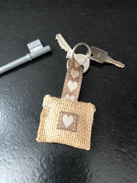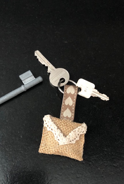Voici un autre porte clé tout mignon. il n’est pas au crochet et il est très facile à réaliser. Je l’utilise pour accrocher les clés de la boite aux lettres. Un peu de toile de jute, un ruban pour représenter une enveloppe, un peu de rembourrage à l’intérieur de l’enveloppe et j’ai collé tout ça avec le pistolet à colle.