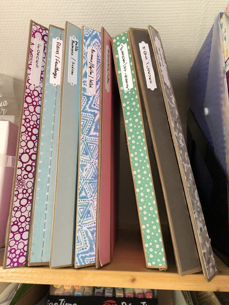 Contrairement à la Caméo, qui n’a besoin que d’un ordinateur, ces machines demandent d’avoir des classeurs d’embossage et des matrices de découpe. Petit à petit mon stock s’agrandi et j’ai du réaliser des boites et classeurs aimanté pour stocker tout ça !