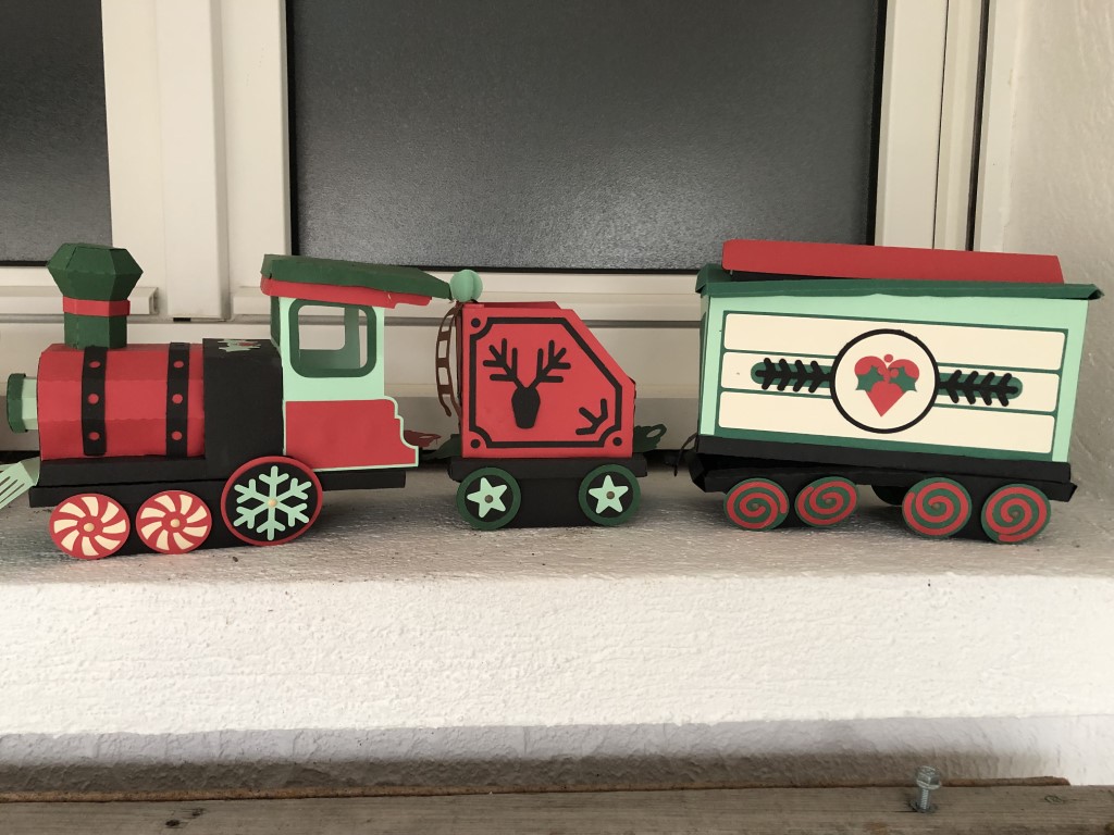 Ce train a été réalisé a partir d’un fichier silhouette que j’ai acheté. J’ai ensuite découpé les différentes parties dans du papier de couleur avec la caméo. La machine ne fait pas le travail de pliage et de collage. J’ai utilisé les instructions et les étapes de montage pour assembler le train.
