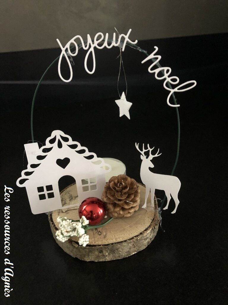 Le texte « Joyeux Noël » a été découpé avec une autre machine. La Caméo a l’avantage de découper n’importe quelle forme de n’importe quelle quelle taille mais cela demande un travail préalable sur l’ordinateur pour créer la forme souhaitée. L’utilisation de matrices de découpe permet une rapidité qui facilite les réalisations alors, j’ai craqué et j’ai acheté une machine de découpe et d’embossage électrique. La Cut’n Boss qui utilise des dies ou matrices de découpe. Pour chaque forme que l’on souhaite découper, il faut posséder la matrice de découpe correspondante et la taille n’est pas modifiable.