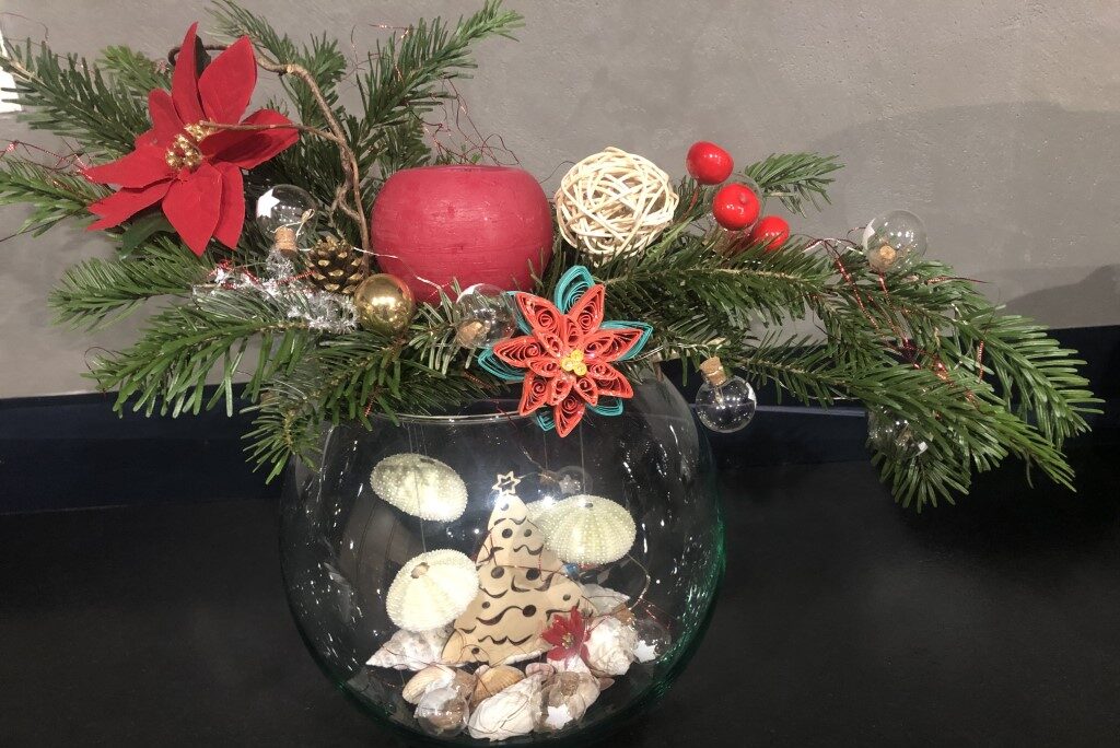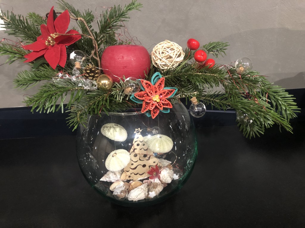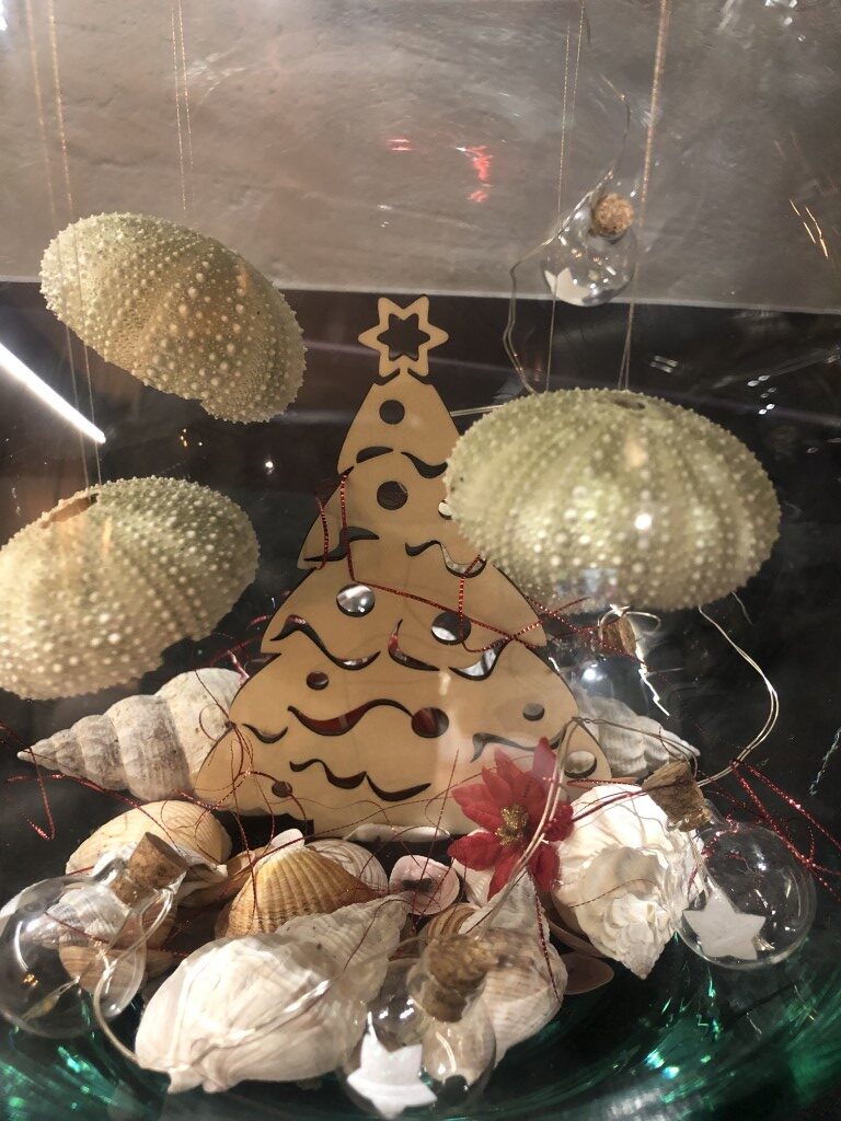 Cet été je ramassais des coquillages et des oursins sur les plages de Norvège pour en faire des décorations de Noël mais l’inspiration m’a manqué pour en faire des marques places comme je l’imaginais. Je tiens malgré tout à utiliser les souvenirs de Norvège dans la décoration de Noël alors j’ai placé les oursins et les coquillages dans l’aquarium et j’ai terminé la décoration avec quelques branches de sapin.