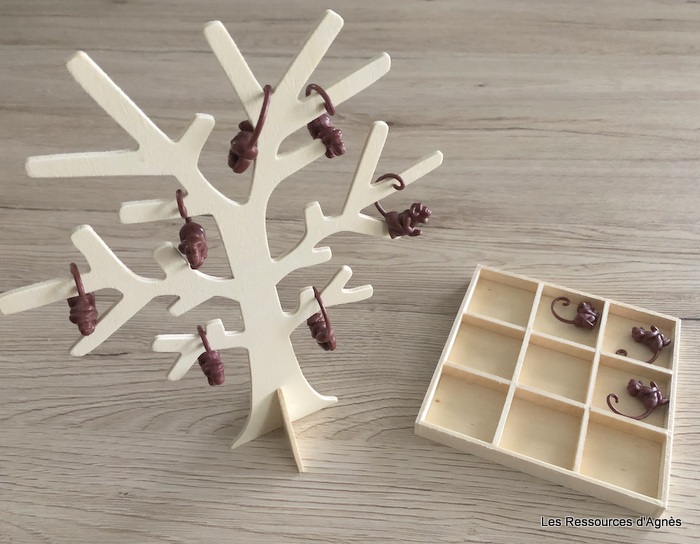 Les singes grimpent ! l’enfant s’amuse à accrocher les singes aux branches de l’arbre. J’ai utilisé un arbre porte bijoux. L’arbre est un peu fragile et se renverse s’il est bousculé. Il faudra peut être aider l’enfant en maintenant la base de l’arbre.