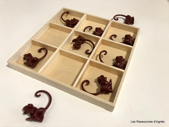 Chacun dans sa maison ! Ici, j’ai demandé à l’enfant de ranger les petits singes chacun dans une petite case. Pour les petites cases, j’ai utilisé l’emballage des embellissements que j’utilise pour le scrap et que j’achète chez Action.