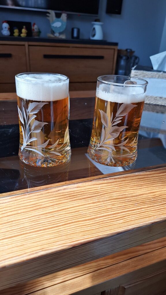 En attendant l’heure d’ouverture pour la visite du plan incliné, nous nous installons sur le parking d’une cristallerie pour le casse croûte. Un copain de Laurent qui voyage en fourgon aménagé reconnaît notre boîte fugueuse. Nous passons un bon moment autour d’un café. Nous visitons également la cristallerie Lehrer où nous avons acheté deux verres à bière.