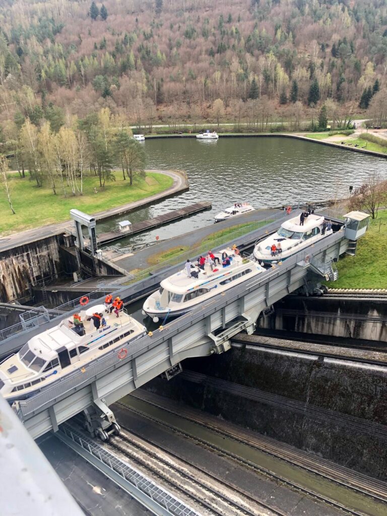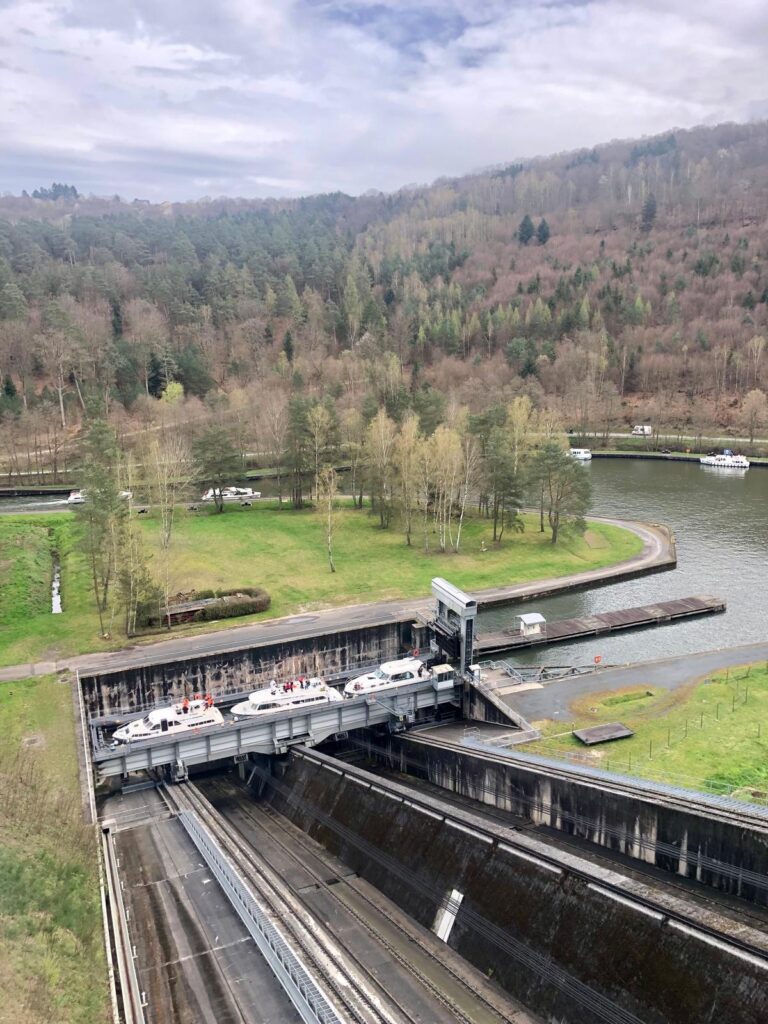 Puis nous allons voir comment fonctionne le plan incliné d’Arzviller. C’est un ascenseur à bateau construit en 1969. Il remplace 17 écluses et permet donc aux bateaux de franchir un dénivelé de plus de 44m en quelques minutes alors qu’il fallait une journée aux bateaux pour franchir les 17 écluses.