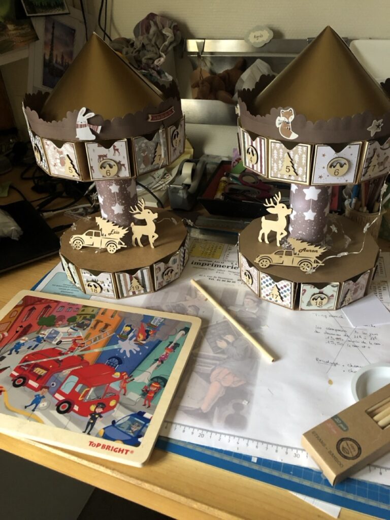 J’ai commencé par acheter un puzzle 24 pièces en bois. A 3 ans, il font justement des puzzles de 24 pièces. ça tombe bien, il y a 24 jours pour attendre Noël 😉 J’ai ajouté un peu de chocolat dans le toit du manège.