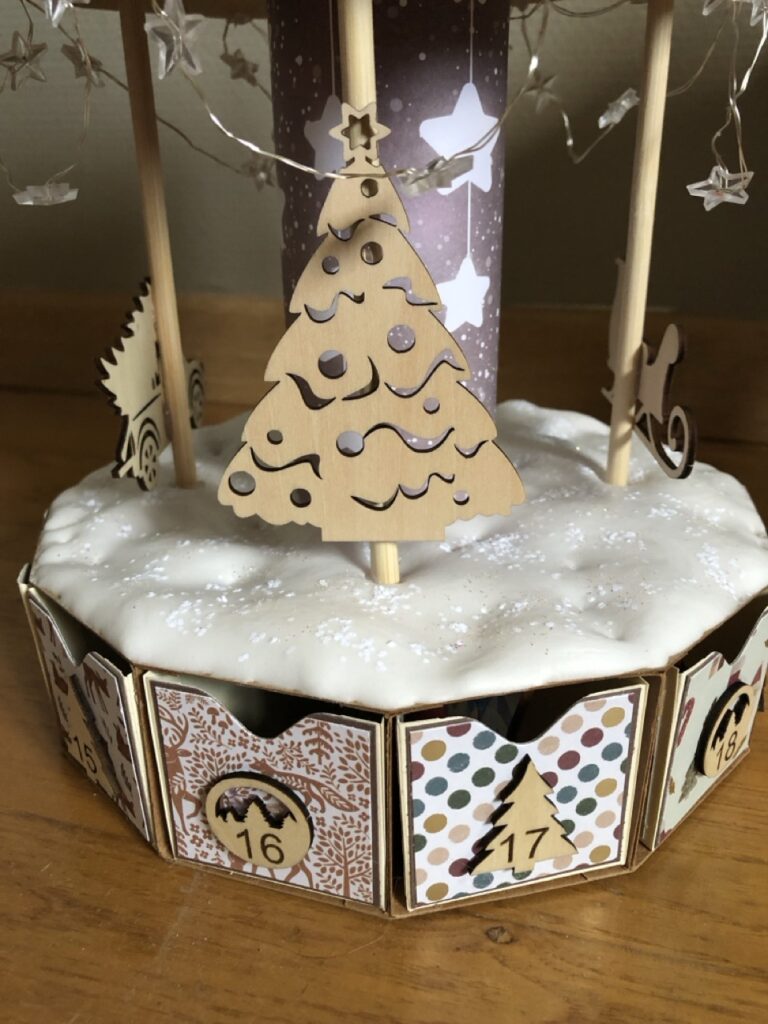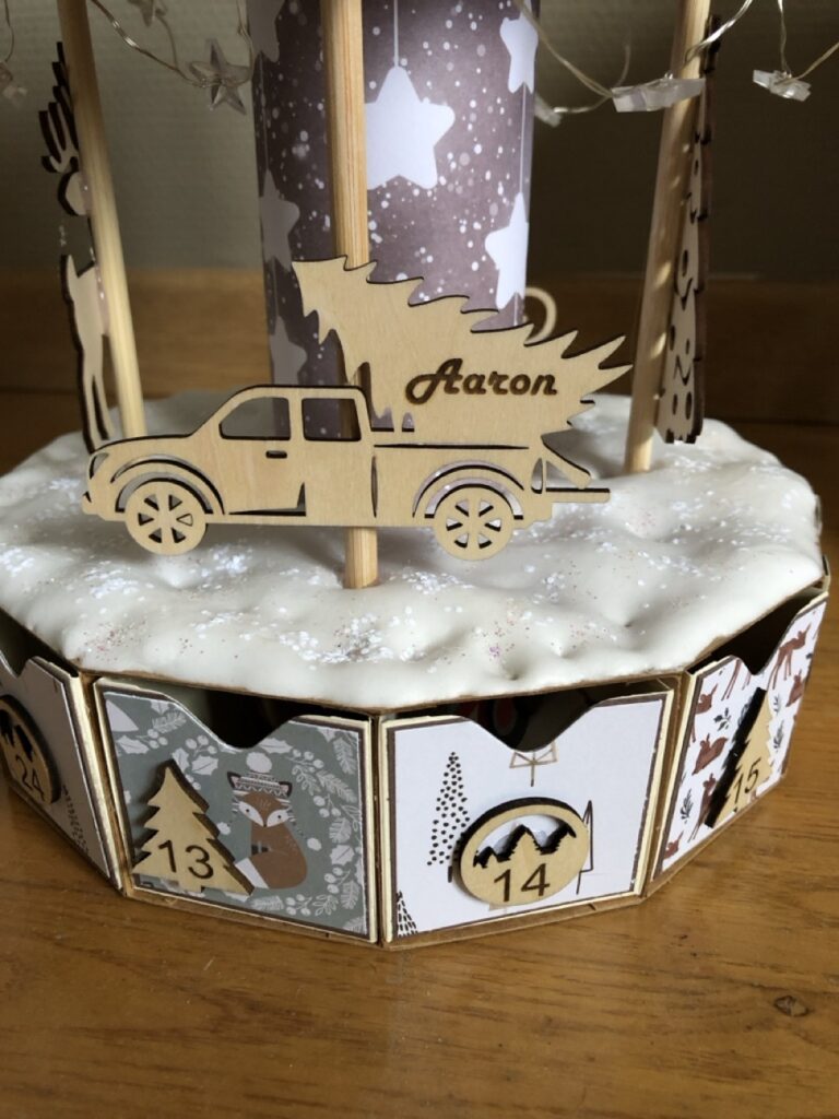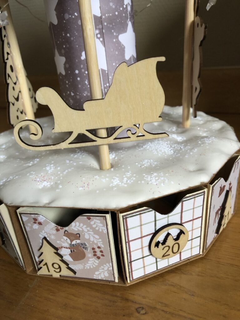 Voici le calendrier avec les finitions. Le sol en neige est fait avec de la colle blanche et de la mousse à raser. Laurent s’est chargé des décos en bois et des chiffres sur les cases avec sa machine de découpe laser.