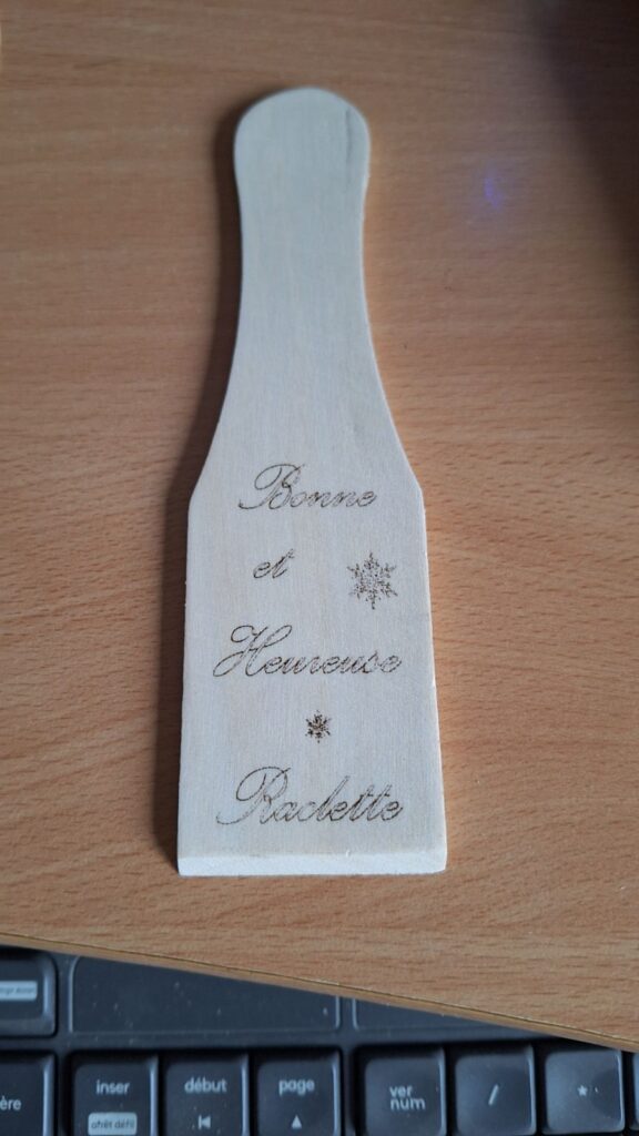 C’est plutôt pour une blague que Laurent à gravé des spatules à raclette. Nous avons acheté les spatules dans le commerce. Il a fallu centrer la machine pour placer correctement les gravures.