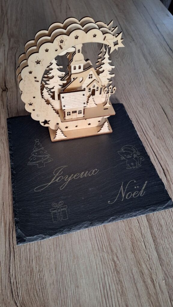 L’assiette en ardoise qui sert de base à la décoration est gravée avec la même machine. Cet ensemble à été offert. Tous les modèles que je vous présente sont réalisés à partir de plans de découpe gratuits trouvés sur internet.