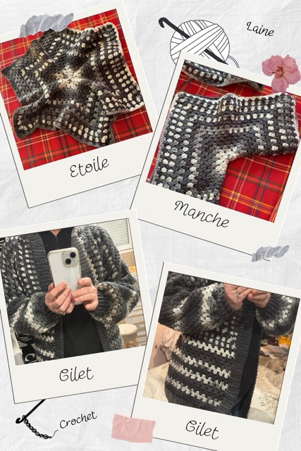 Sur les réseaux sociaux, j’ai vu qu’on pouvait faire un gilet avec cette méthode. J’ai donc acheté de la laine et j’ai crocheté une nouvelle étoile. Je suis vraiment satisfaite du résultat, j’ai déjà porté plusieurs fois ce gilet.