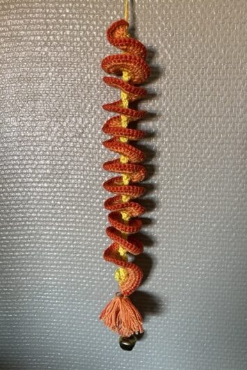 Pour m’amuser et par curiosité, j’ai crocheté un wind spinner. Le travail s’enroule sur lui même au fur et à mesure de la réalisation.