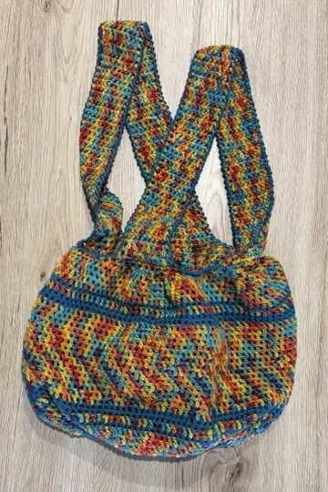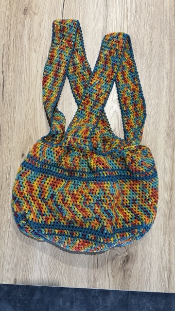En achetant ma laine, j’ai trouvé un prospectus proposant la réalisation d’un sac de course. Sitôt le gilet terminé, je me suis mise au travail. Je n’ai pas bien compris les explications pour la réalisation des anses. Après plusieurs essais, j’ai abandonné les explications et j’ai fait comme je le sentais. Ce sac est top. Le volume et la solidité correspondent tout à fait à mes besoins.