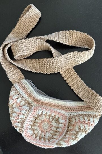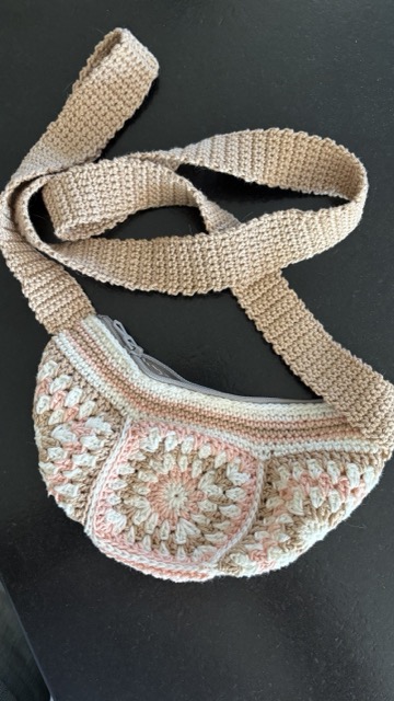Les sacs banane sont à nouveau à la mode, Lorsque j’ai vu une photo d’une petite sacoche banane, j’ai aussitôt fait 4 carrés granny que j’ai assemblé et cousu à une fermeture éclair pour faire une petite pochette. J’ai du ajouter quelques rangs avant la fermeture éclair pour que la pochette soit assez grande pour contenir mon téléphone. La sangle a été un peu fastidieuse à réaliser mais par petites étapes, devant la télévision j’en suis arrivée à bout. Je suis bien contente du résultat, je peux mettre dans cette pochette, mon téléphone, mes clés et un paquet de mouchoir pour les petites balades.