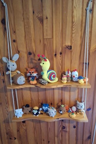 Je vais aussi parler du travail de Laurent. Il a transformé les pieds d’une table en pin que nous n’utilisions plus pour en faire une étagère sur laquelle je mets mes réalisations. Merci Laurent.