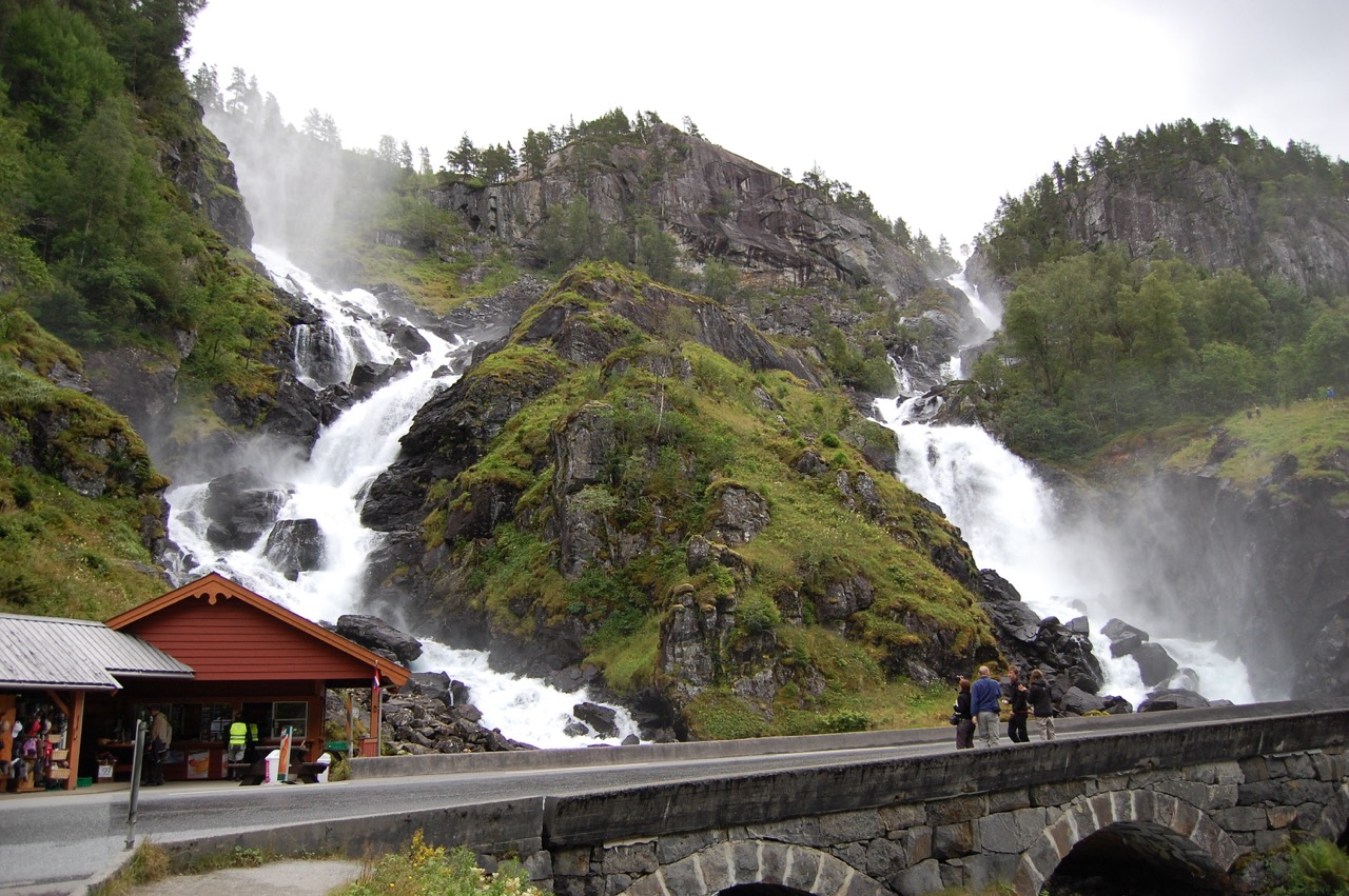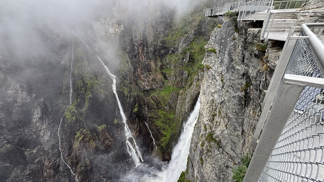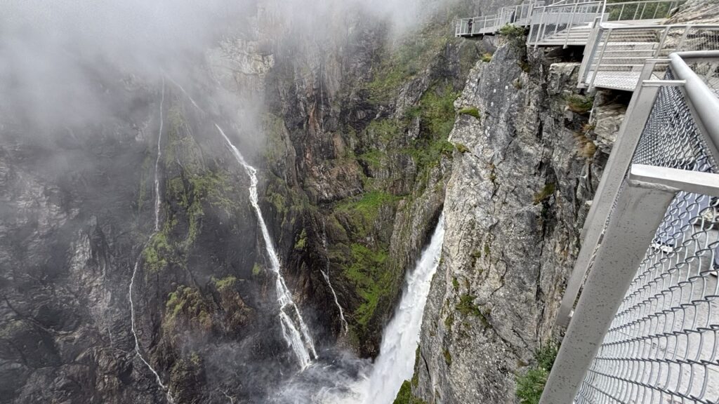 Avant de parler de nos dernières visites, je voulais revenir un peu sur la Norvège. Je ne vais pas m’étendre plus que ça puisque 6 articles dans ce blog décrivent en détail ce que nous y avons déjà vécu : « le cap Nord » « Au soleil de minuit » « Les îles Lofoten » « un glacier, la mer…le centre de la Norvège » « Au pays des trolls » « Le retour, bilan de 6 semaines de vadrouille en Norvège ». C’est la troisième fois que nous visitons ce pays avec toujours autant d’étoiles dans les yeux. Bien sûr, nous sommes un peu déçus cette année par la météo mais c’est le risque à prendre quand on souhaite visiter la Norvège. Les photos sont moins jolies mais le temps humide ne nous a pas empêché de profiter de magnifiques paysages. Le débit des cascades est impressionnant. La Norvège reste jolie, même sous la pluie. Comme je l’ai déjà dit, nous avons tout le confort nécessaire pour vivre avec cette pluie. Cela est juste moins agréable. La boîte fugueuse est très bien isolée de la pluie. La condensation qui s’accumule à l’intérieur est notre seul petit soucis. Avec la pluie, nous n’avons pas beaucoup utilisé notre douche extérieure mais la toilette est tout à fait possible à l’intérieur. Cela ajoute juste un peu d’humidité 😂 Nous avons déjà pris cette route il y a 13 ans. La région était bien moins touristique à l’époque. Nous avons déjà testé les ronds point dans les tunnels mais il n’y avait pas un service de sécurité devant la cascade Latefossen pour faire la circulation. Il n’y avait pas de convoi pour emprunter les routes les plus étroites, le parking du glacier du Buer était gratuit et il n’y avait pas de grands aménagements avec un grand parking, des chemins entièrement protégés, avec des barrières, des passerelles et des points de vue style « pas dans le vide » à la cascade « Voringsfossen »