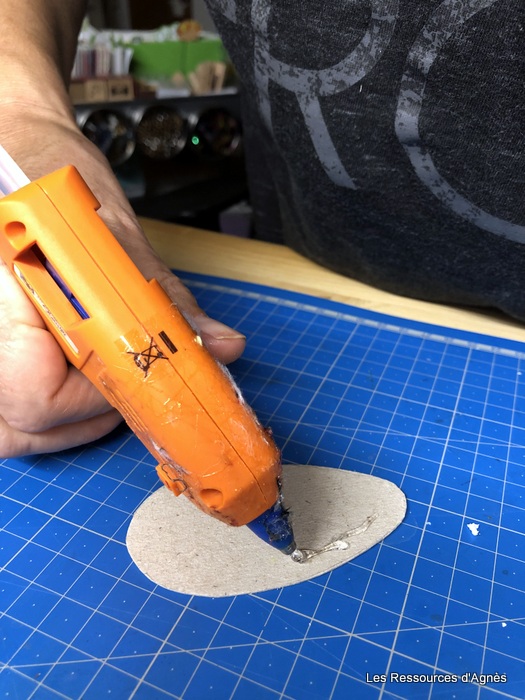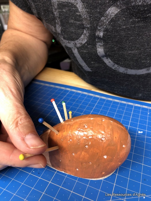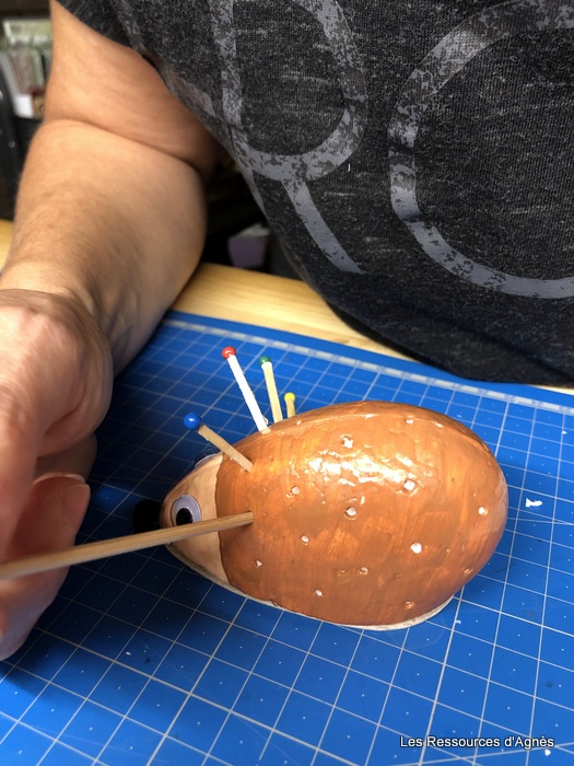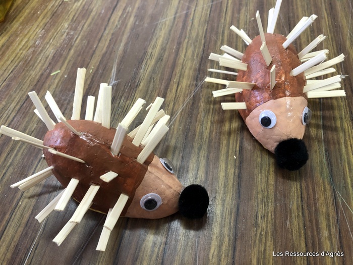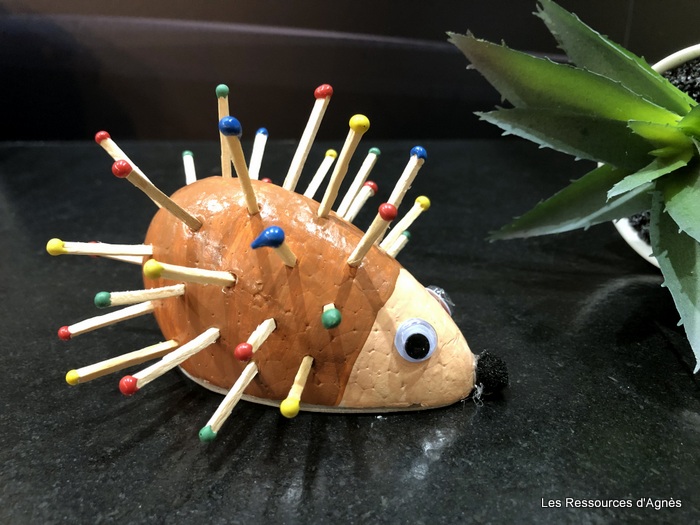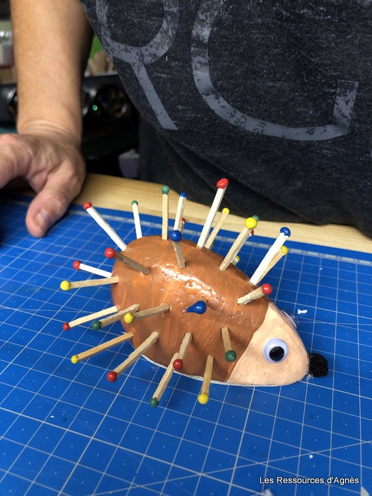 Lorsque tout est sec (le séchage est assez rapide) on peut mettre les piques. J’ai utilisé les allumettes d’un vieux jeu. On peut bien sûr utiliser d’autres piques. J’ai essayé avec des petits bâtonnets achetés chez action. Ils sont un peu longs alors je les ai cassé en 4. Un pré-trou avec un pique à brochette est nécessaire pour les allumettes. Pour les bâtonnets, j’ai fait une petite incision avec un cutter. L’insertion des piques (allumettes ou bâtonnets) demande une bonne motricité pour viser le pré-trou et ne pas toucher les allumettes déjà en place. Il faut également un peu de force dans les doigts. Pour terminer, j’ai fait une découpe dans un morceau de carton que j’ai collé sur le fond du hérisson sans oublier bien sûr de coller un petit pompon pour le museau et des yeux.